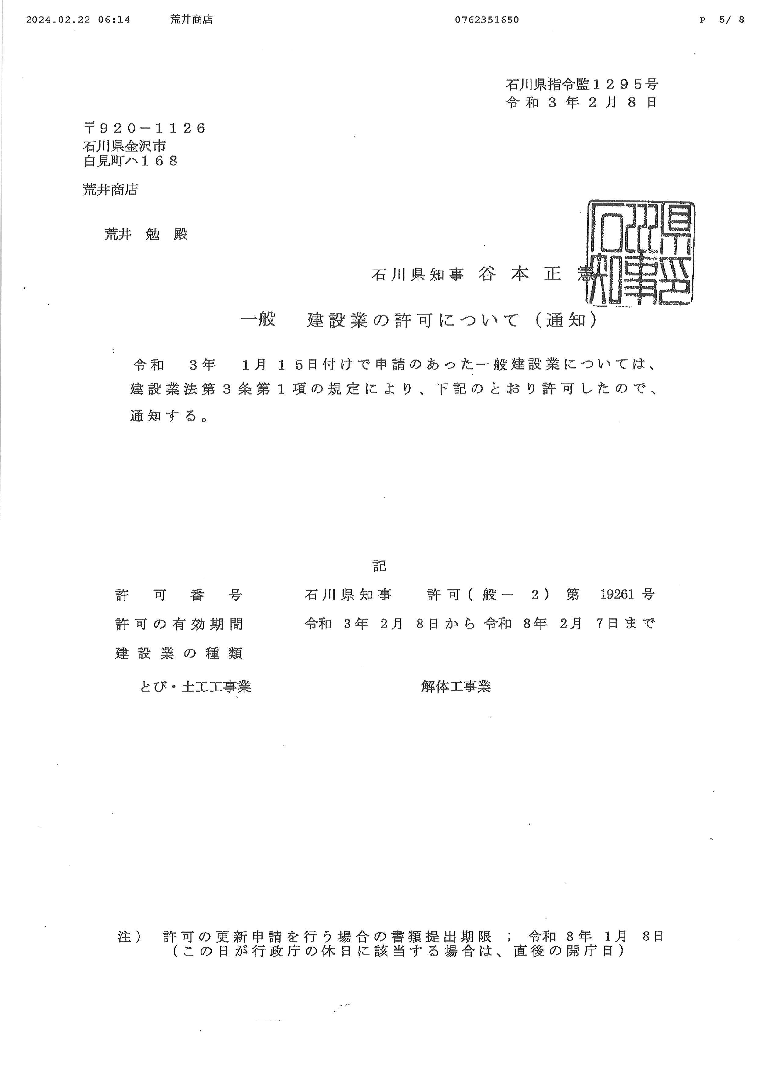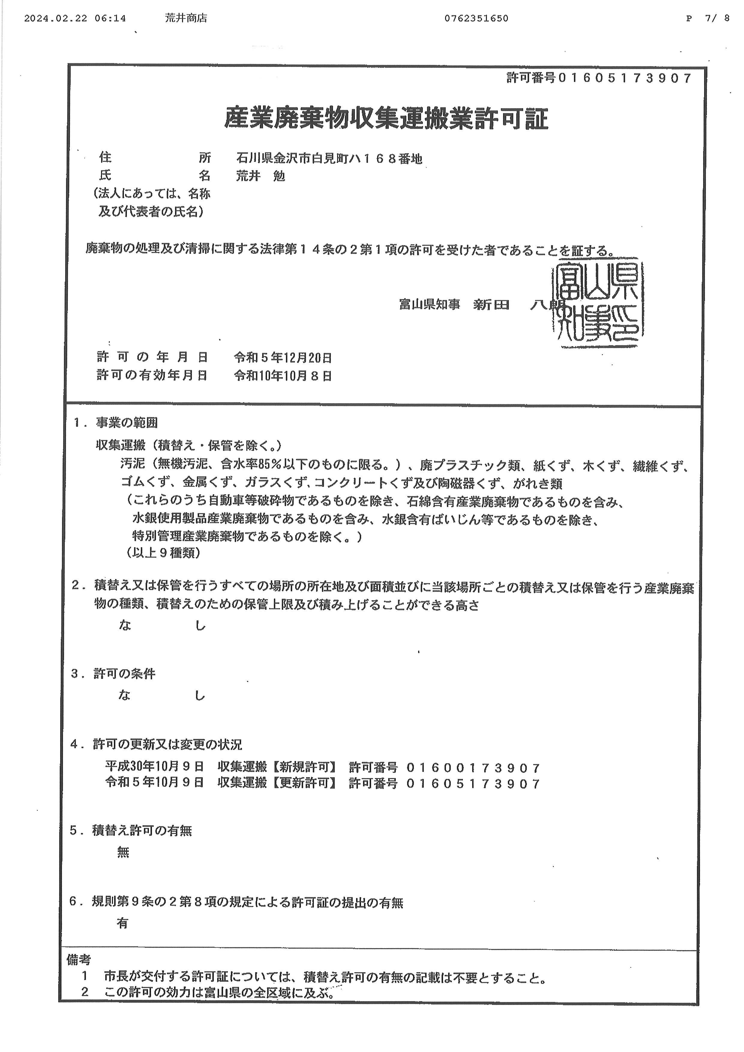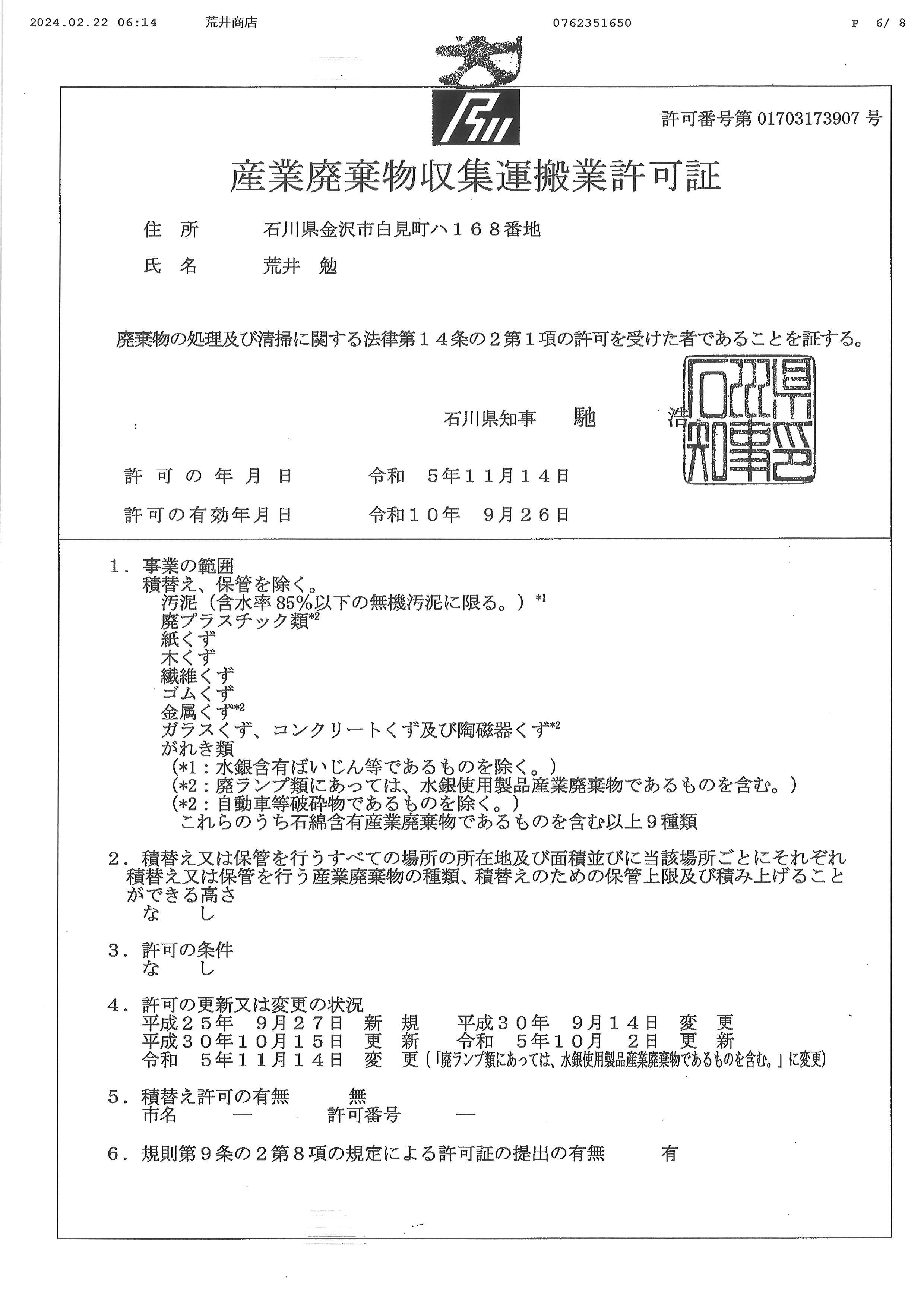| 許可・資格 | 石川県知事 許可(般-2)第19261号 産業廃棄物収集運搬業許可 第01703173907号 産業廃棄物収集運搬業許可 第01605173907号 産業廃棄物収集運搬業許可 第01801173907号 |